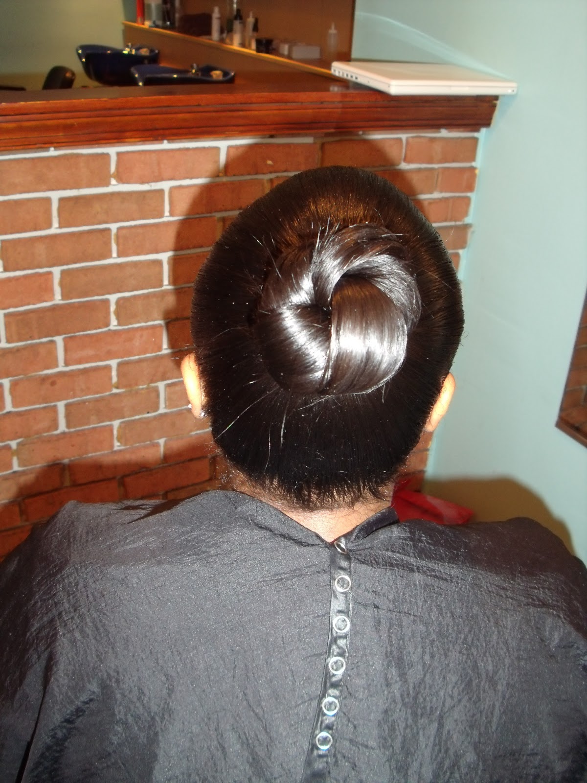 This style can be achieved by using pomade or styling gel. Take a brush, brush the hair in a secure ponytail then wrap the hair securely around. Once the hair is fully wrapped, use the bobby pins to hold the hair in place. |