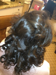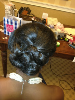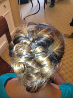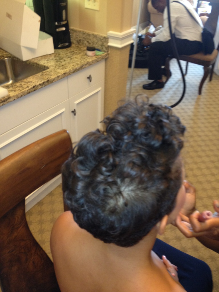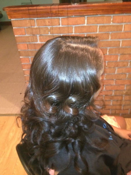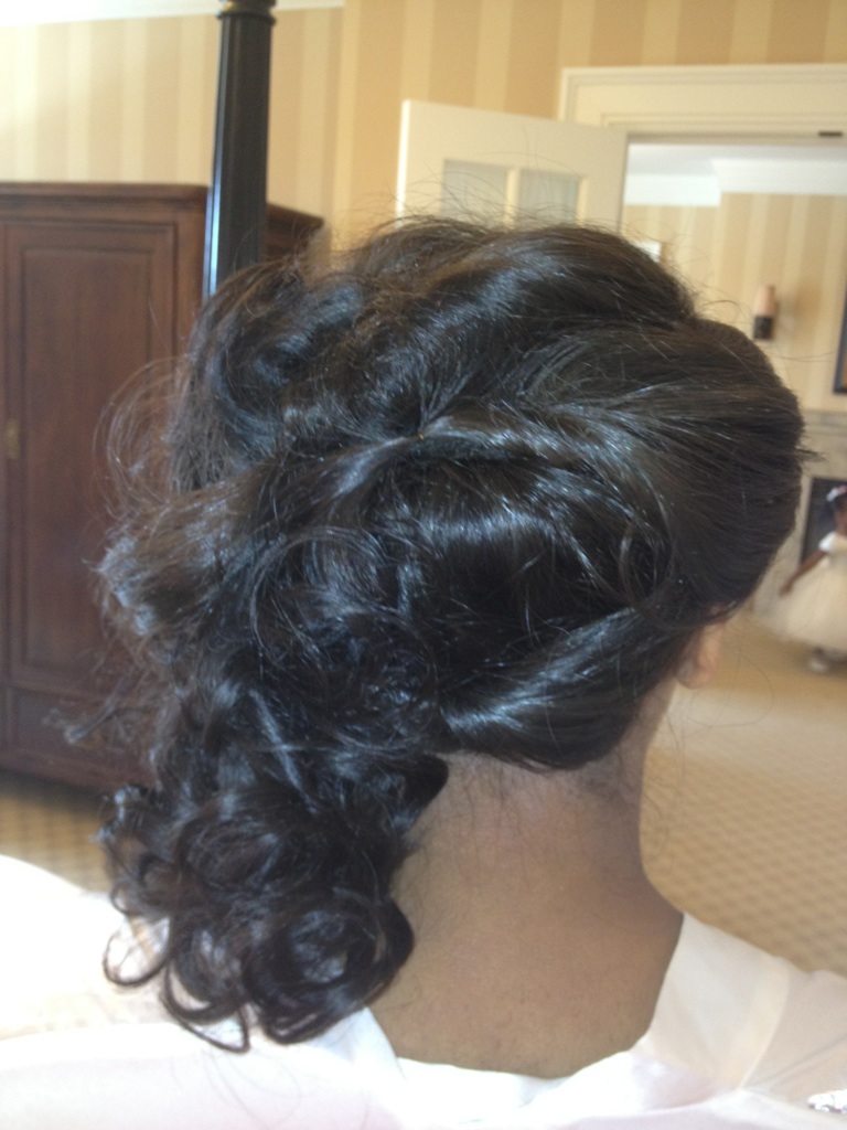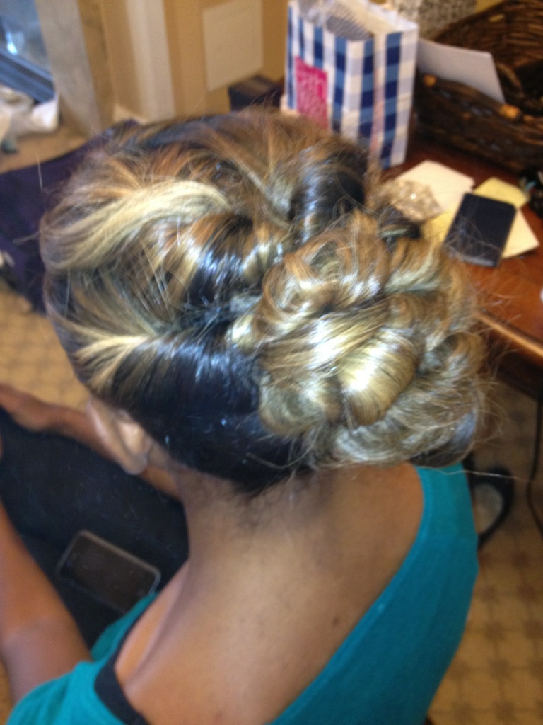 Natural hair Colored, pressed, ceramic curled, and softly pinned |