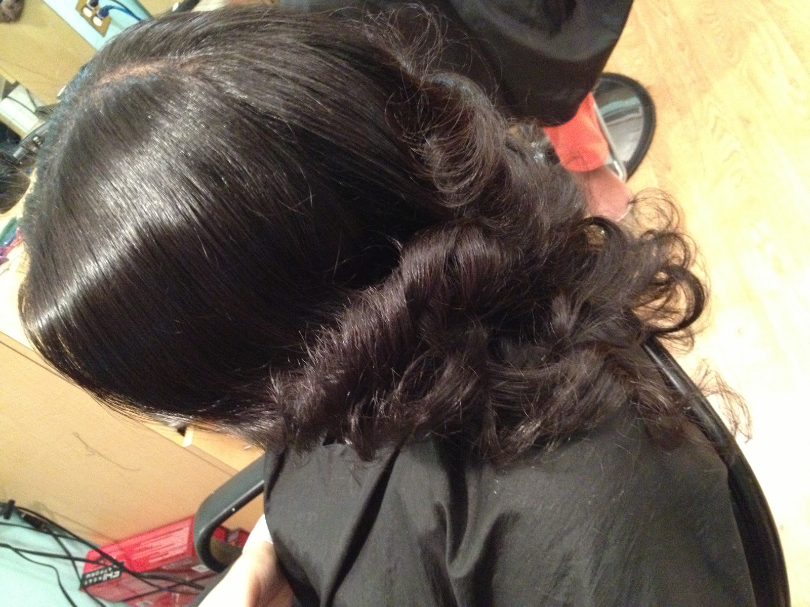 Natural Hair, Pressed, trimmed, and ceramic curled