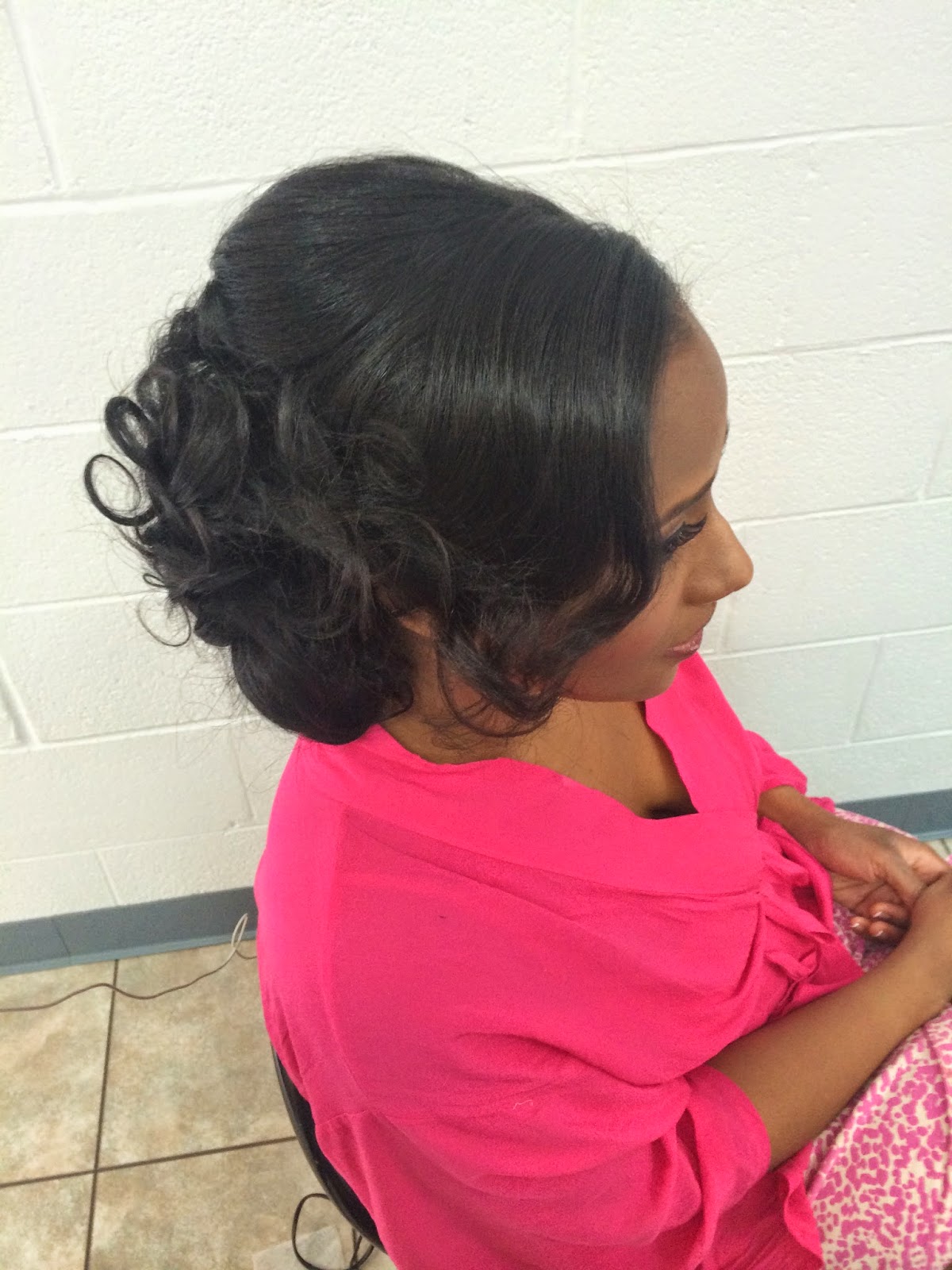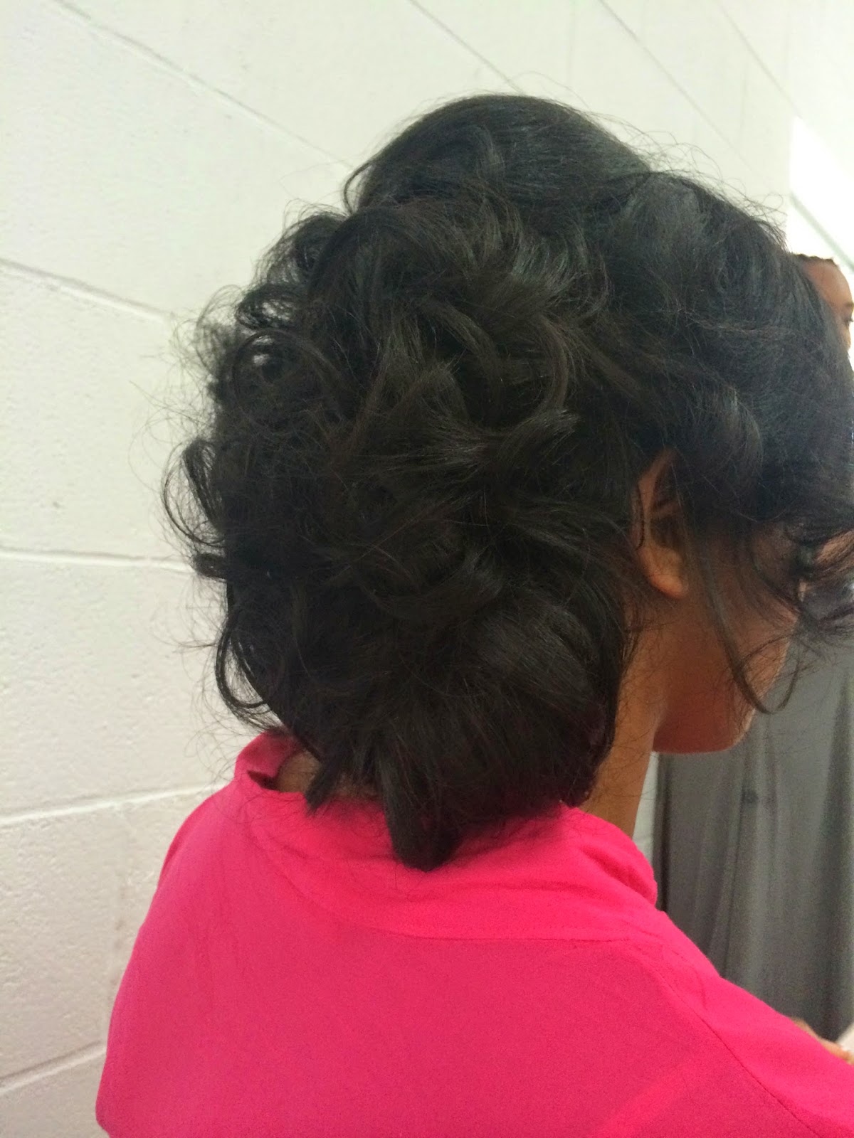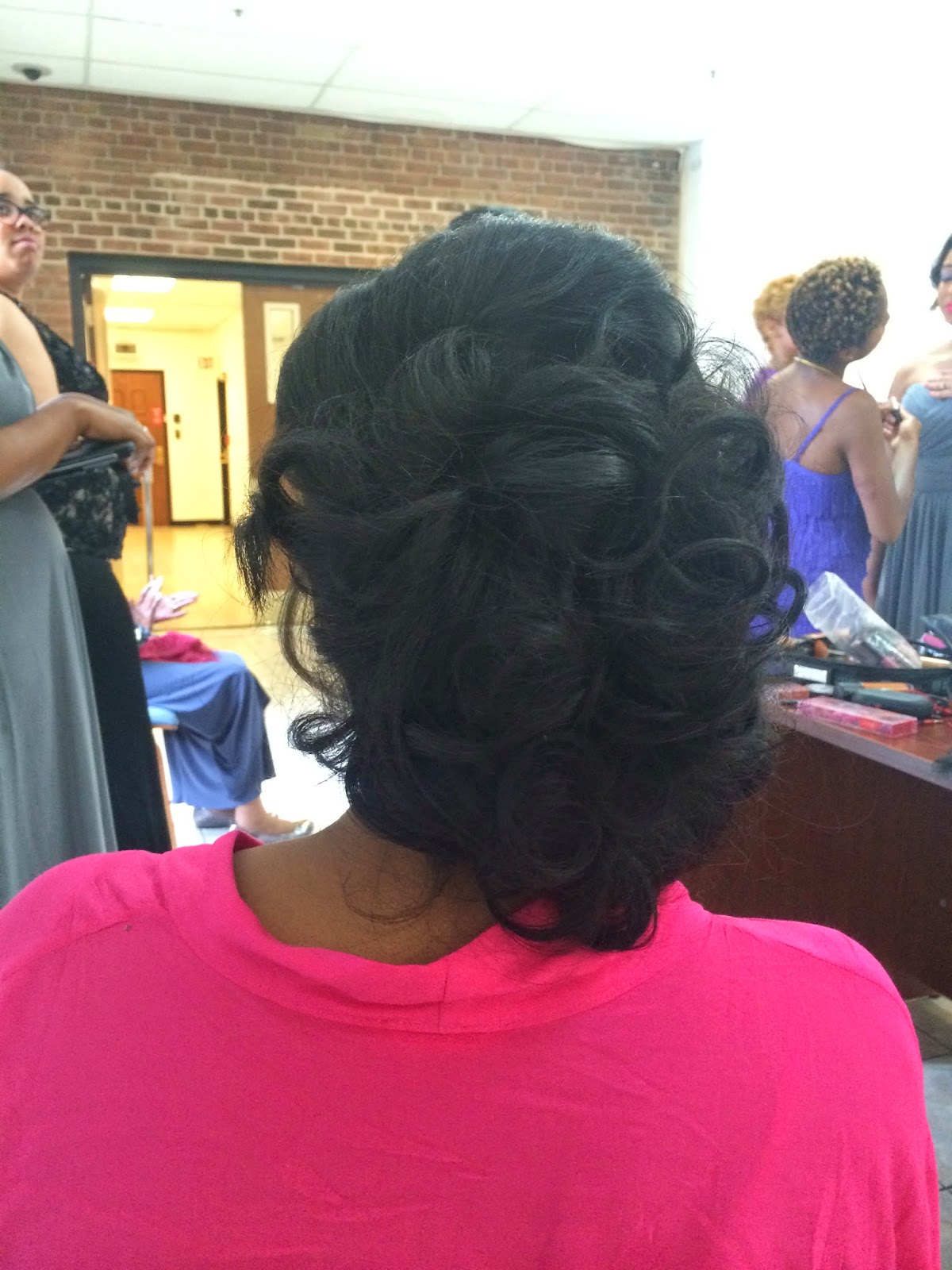 July 5, 2014... The wedding day, I relied upon visuals from 'Pinterest. As I've mentioned in previous post, I love 'Pinterest' because of the inspiration that I get time and time again from it. I like that I can get inspiration so that I can create my own style. It never looks exactly the same as the picture. That's the beauty of being an artist. There are no 2 artists' that are the same. It was also the plan for her to have 2 different hairstyles for her wedding day so I created 2 updo looks. They looked pretty similar but they were different. I like soft updos because you can get 2 hairstyles out of one. If you want the option to wear it down after the wedding you can because it's not a ton of product in the hair.